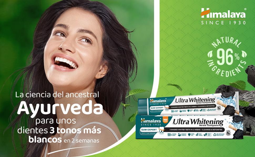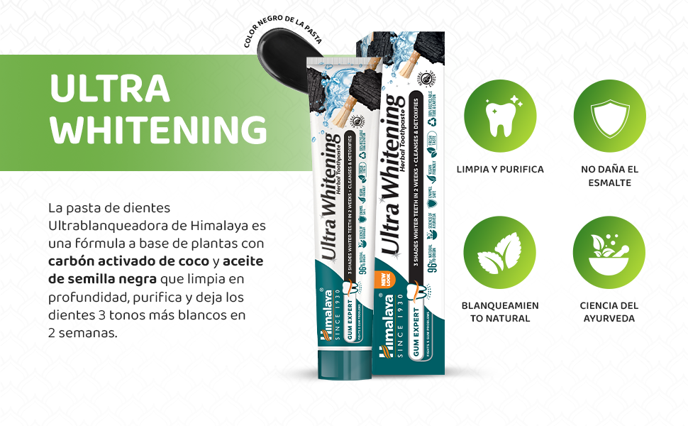 La pasta de dientes Ultrablanqueadora de Himalaya es una fórmula a base de plantas con carbón activado de coco y aceite de semilla negra que limpia en profundidad, purifica y deja los dientes 3 tonos más blancos en 2 semanas.