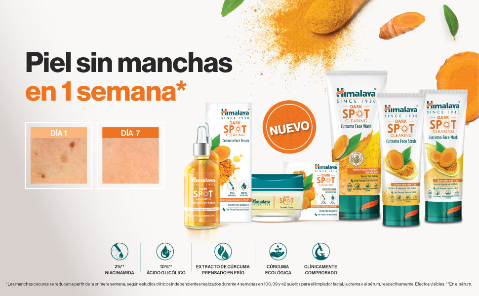 Himalaya Dark Spot Clearing Curcuma Face Mask aprovecha la bondad del extracto de Cúrcuma prensado en frío y el regaliz. Con los potentes extractos antioxidantes de cúrcuma y regaliz, esta mascarilla facial ayuda a eliminar las impurezas profundamente asentadas, revitaliza la piel opaca y ayuda a atenuar las manchas oscuras, dejándola con una piel visiblemente clara, fresca y radiante.