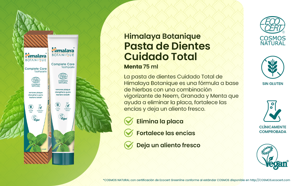 La pasta de dientes Cuidado Total de Himalaya Botanique es una fórmula a base de hierbas con una combinación vigorizante de Neem, Granada y Menta que ayuda a eliminar la placa, fortalece las encías y deja un aliento fresco.