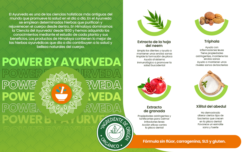 Extracto de la hoja del neem, Triphala*, Extracto de granada*, Xilitol del abedul