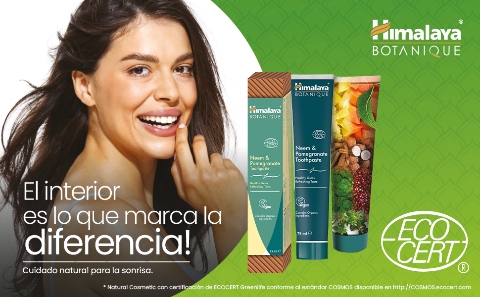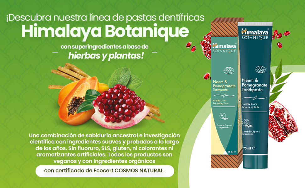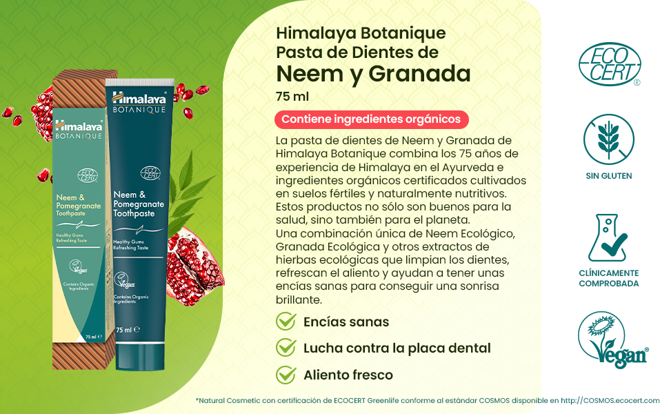 La pasta de dientes de Neem y Granada de Himalaya Botanique combina los 75 años de experiencia de Himalaya en el Ayurveda e ingredientes orgánicos certificados cultivados en suelos fértiles y naturalmente nutritivos. Estos productos no sólo son buenos para la salud, sino también para el planeta.