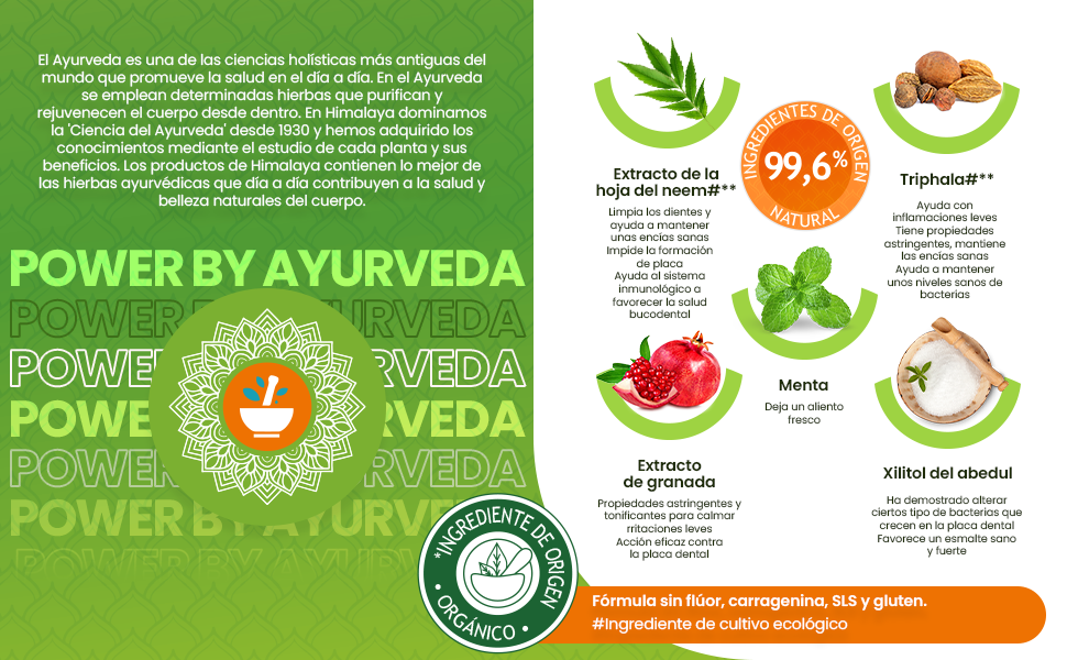 Extracto de la hoja del neem, Triphala*, Extracto de granada*, Xilitol del abedul, Menta