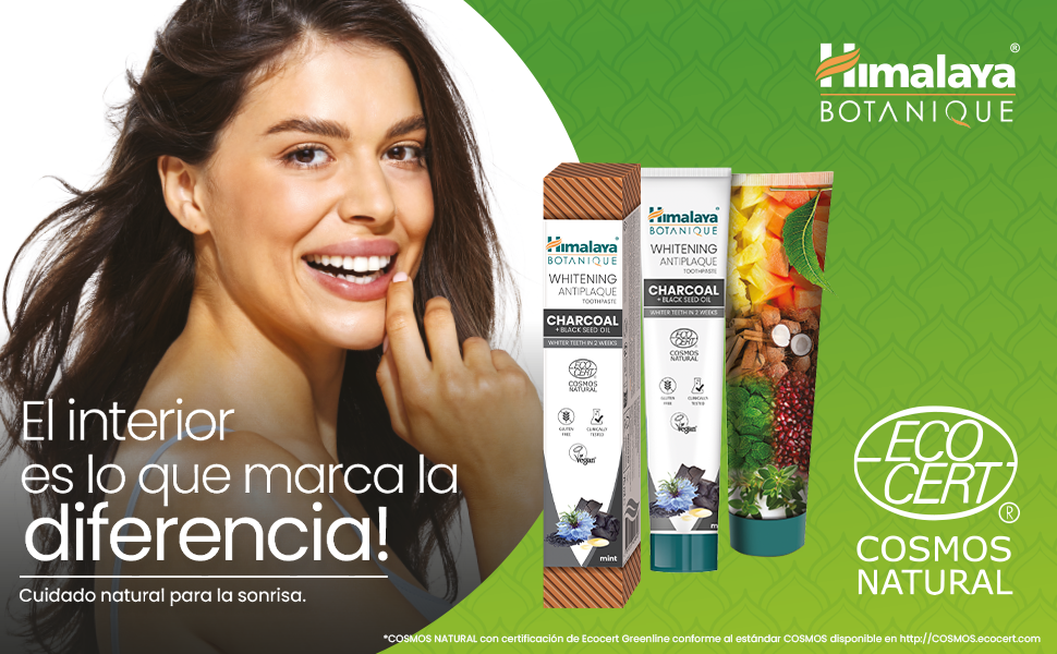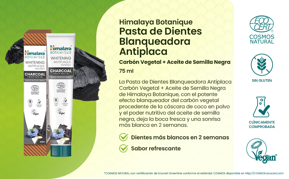 La Pasta de Dientes Blanqueadora Antiplaca Carbón Vegetal + Aceite de Semilla Negra de Himalaya Botanique, con el potente efecto blanqueador del carbón vegetal procedente de la cáscara de coco en polvo y el poder nutritivo del aceite de semilla negra, deja la boca fresca y una sonrisa más blanca en 2 semanas.