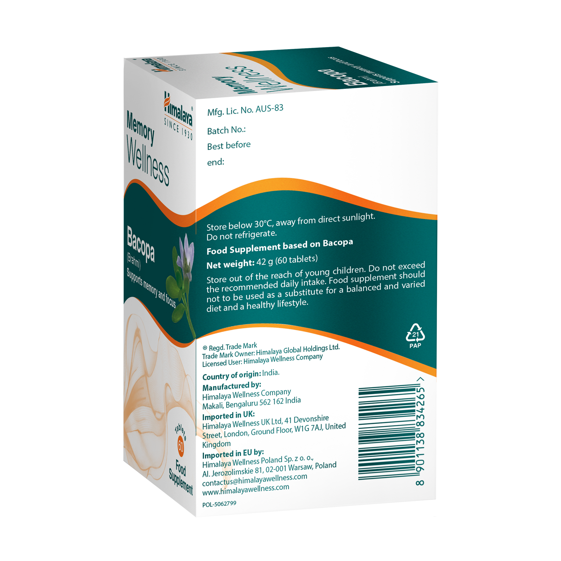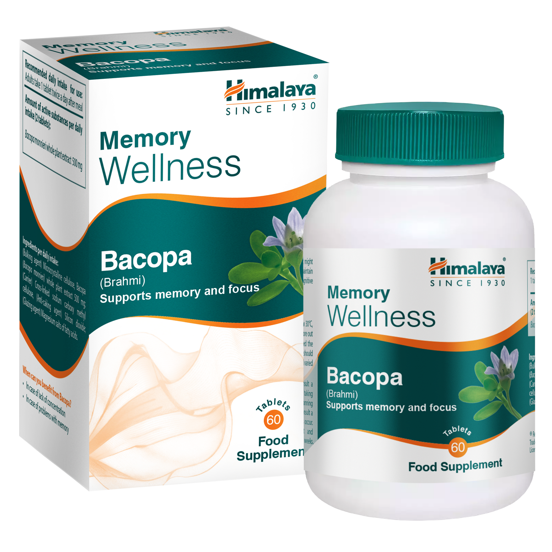 Favorezca su mente con los comprimidos Himalaya Memory Wellness Bacopa, un complemento natural de origen vegetal diseñado para mantener la mente alerta, concentrada y con energía mental. Cada dosis diaria aporta 500 mg de extracto de la planta entera de Bacopa monnieri, un nootrópico de confianza utilizado en Ayurveda para favorecer la memoria, la concentración, las habilidades de aprendizaje y la función cognitiva que puede disminuir con la edad.